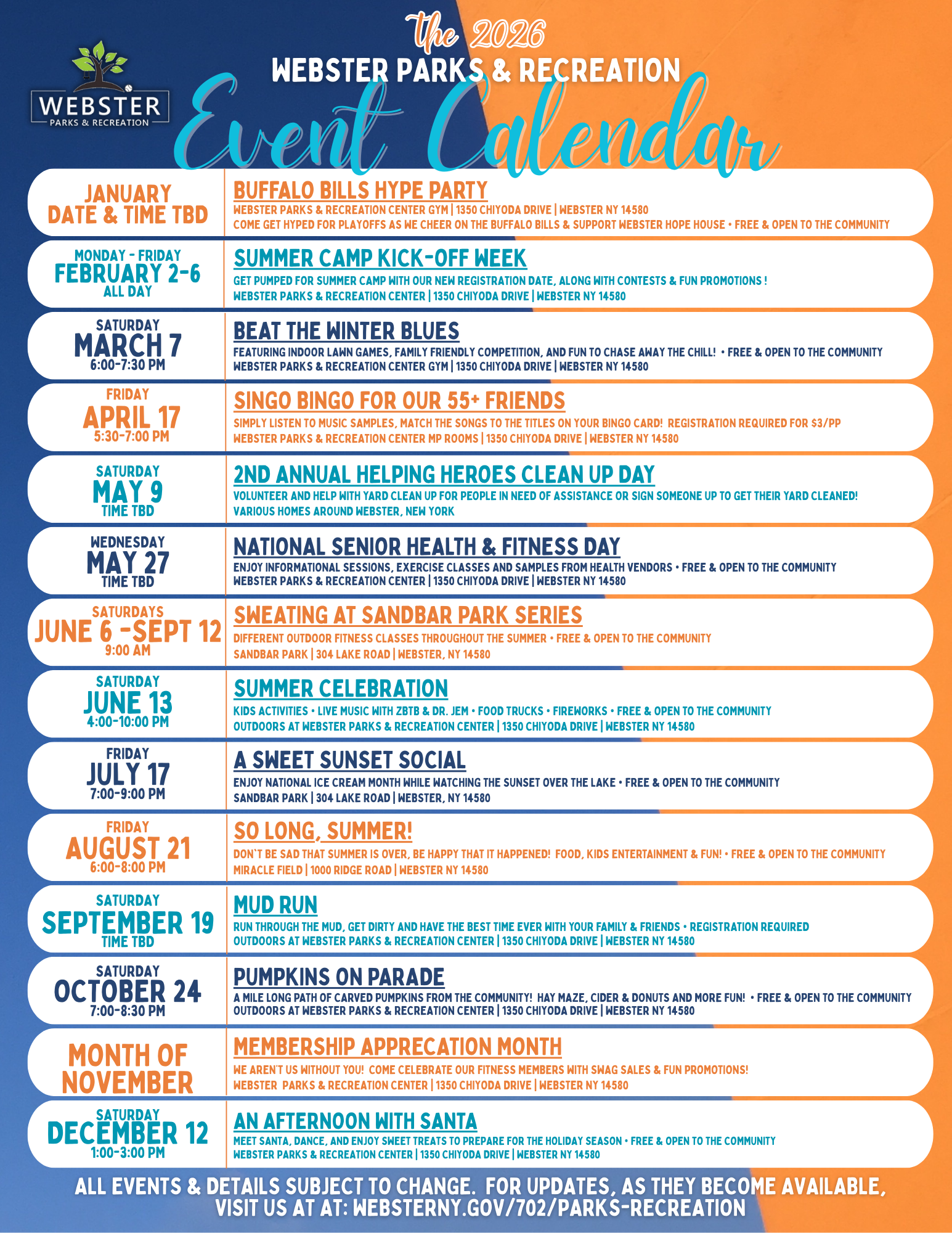 Webster Parks and Recreation offers a variety of family programs throughout the year and we invite you to join us!  For more information, click on the flyers below as some may require registration and be sure to check back frequently for updates.   We hope to see you!